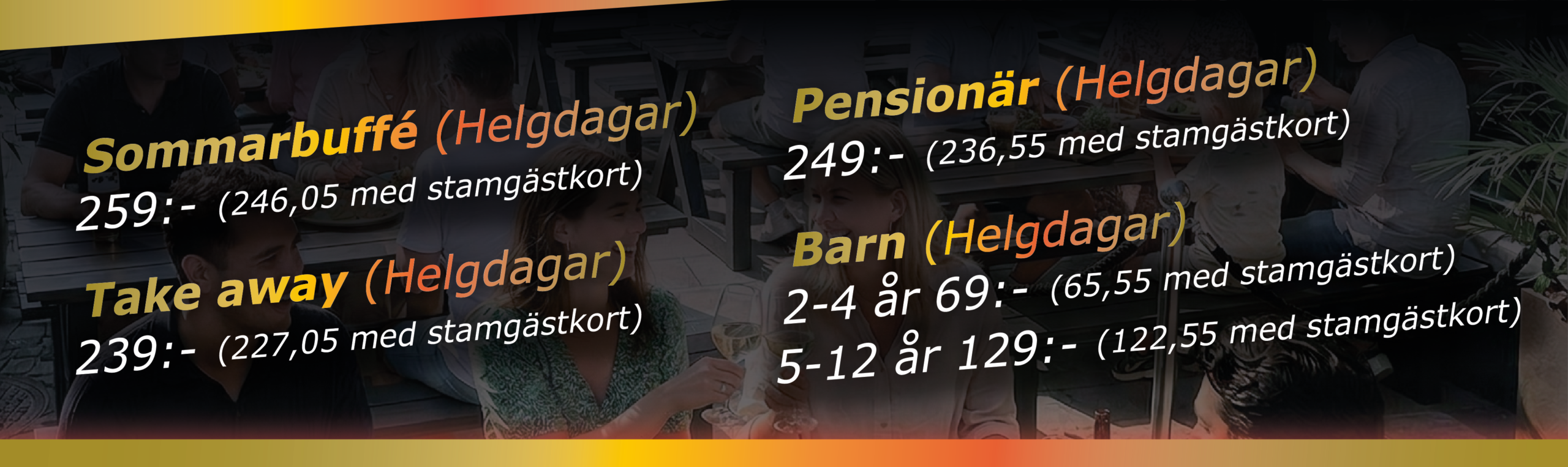 Med stamgästkortet får du rabatt på vår populära lunchbuffé och andra förmåner. Detta innebär att du kan njuta av en riklig och varierad måltid till ett ännu bättre pris. Vår lunchbuffé inkluderar alltid flera olika rätter, inklusive vegetariska alternativ, samt en salladsbuffé, bröd, dryck och kaffe. Med rabatten blir din lunchupplevelse både ännu mer prisvärd och mättande. Vill du bli stamgäst så hittar du mer information här!
